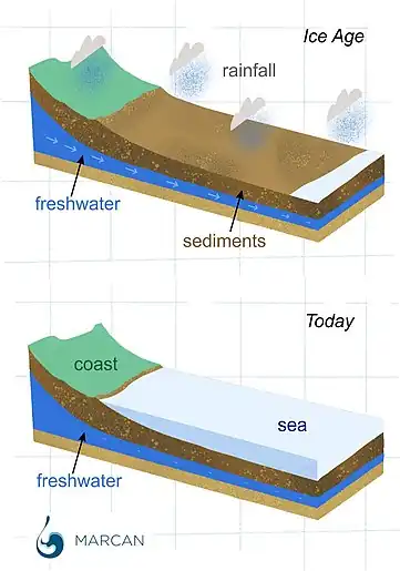 - La recharge météorique par la pluie qui peut être soit un événement paléo-météorique lors des basses eaux du niveau de la mer, soit une recharge météorique active via des connexions perméables entre les aquifères offshore et terrestres (voir infra)[1],[3],[4],[5],[6],[7].