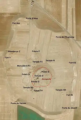Le dispositif de défense était renforcé par une série de portes fortifiées et de fortins auxquels les archéologues modernes ont donné des noms suivant leur localisation, leur nom antique étant perdu. Au nord-ouest, la « porte d'Alep » était jouxtée par la « forteresse AA », à l'ouest. Le côté ouest était défendu par le « fort V », et dans la zone Z, aux pieds du rempart, ont été dégagées plusieurs habitations cossues dont la « résidence occidentale » qui a pu avoir une fonction administrative. La « porte de Damas », au sud-ouest, était protégée par une tour de défense et un fortin. L'angle sud-est de la muraille comprenait une autre forteresse et la « porte du désert » (ou de la steppe). Le côté est de la muraille était défendu par la « Forteresse M », mesurant 27 × 13 mètres et constituée de deux rangées de pièces parallèles. Le côté nord-est était défendu par une autre forteresse, au nord de laquelle on trouvait une dernière porte (« porte de l'Euphrate »)[62].