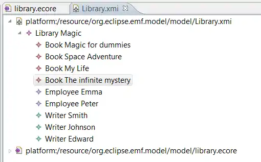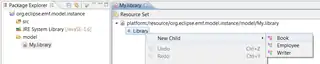Une fois ce méta-modèle définit, nous pouvons l'utiliser avec l'éditeur basique pour fichier "ecore" pour créer une instance du concept "Library" dans le méta-modèle. On peut donc voir sur la capture suivante, l'éditeur basique d'EMF avec une instance de nos concepts Library, Book, Employee et Writer. Lorsque l'on sélectionne un élément, on peut voir et éditer ses attributs dans la vue "Properties".