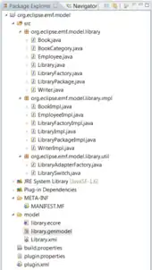 Par défaut, le code généré par EMF comprend les interfaces représentant les concepts du méta-modèle (dans le package org.eclipse.emf.model.library dans l'exemple), les classes d'implémentation de ces interfaces (dans le package org.eclipse.emf.model.library.impl) ainsi que deux classes utilitaires comprenant une classe "xxxFactory" implémentant le patron de conception "Factory". Le code généré par EMF comprend de nombreux mécanismes par défaut tel qu'un système de notifications pour toutes modifications lors de l'utilisation d'une méthode d'accès aux attributs de la classe ainsi que des méthodes permettant de manipuler facilement les classes générées de manière réflective ("eGet" et "eSet" notamment). Il est ainsi possible de connaitre aisément le conteneur d'une instance grâce à la méthode "eContainer()" (dans notre exemple, le conteneur d'une entité de type "Book" serait l'entité racine de type "Library").