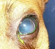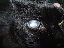 Cependant, le glaucome secondaire à la luxation antérieure du cristallin est plus rare chez les chats que les chiens, puisqu'ils ont naturellement une chambre antérieure plus profonde et que la liquéfaction de l'humeur vitrée est secondaire à une inflammation chronique. La luxation antérieure du cristallin est considérée comme une urgence ophtalmologique[1].
