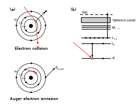 (a) illustre séquentiellement les étapes impliquées dans la désexcitation Auger. Un électron incident (ou un photon) crée un trou de cœur dans le niveau 1s. Un électron du niveau 2s remplit le trou 1s et l'énergie de transition est transmise à un électron 2p qui est émis. Le niveau atomique final a ainsi deux trous, un sur l'orbitale 2s et un autre sur l'orbitale 2p.