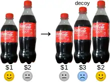 En marketing, l'effet de leurre (ou l'effet d'attraction ou l'effet de domination asymétrique) est le phénomène par lequel les consommateurs ont tendance à avoir un changement spécifique de préférence entre deux options lorsqu'on leur présente une troisième option étant asymétriquement dominée[1]. Une option est asymétriquement dominée lorsqu'elle est inférieure à tous égards à une option; mais, comparée avec une autre option, elle est inférieure sur certains points, supérieure sur d'autres. En d'autres termes, en matière d'attributs spécifiques à la détermination des préférences, elle est complètement dominée par (c'est-à-dire inférieure à) une option et seulement partiellement dominée par l'autre. Lorsqu'une option asymétriquement dominée est présente, un pourcentage plus élevé de consommateurs préfèrent davantage l'option dominante que lorsque l'option asymétriquement dominée est absente. L'option asymétriquement dominée est donc un leurre servant à augmenter la préférence pour l'option dominante. L'effet de leurre est également un exemple de la violation de l'axiome de l'indépendance des alternatives non pertinentes de la théorie de la décision.