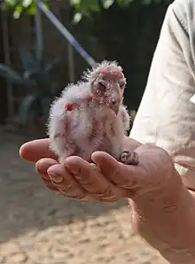 Les œufs sont pondus à même le sol et la femelle les couve de 30 à 32 jours[20] pendant que le mâle chasse pour la nourrir. Les éclosions étant étalées sur une à deux semaines, la taille et le plumage des petits varient énormément. Les jeunes quittent le nid [21] à 2 mois environ ; ils sont nourris par les deux parents. Chaque nuit, les deux parents tuent et transportent une quarantaine de petits mammifères et parfois de petits oiseaux pour se nourrir, eux et leurs petits[réf. nécessaire]. À la naissance les petits pèsent environ 15 g. La femelle les protège et les nourrit pendant presque un mois.