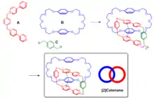 Les systèmes π sont des éléments de base importants dans l'assemblage supramoléculaire en raison de leurs interactions non-covalentes polyvalentes avec divers groupes fonctionnels. Un exemple notable d'application des interactions π – π dans l'assemblage supramoléculaire est la synthèse de caténane. L'enjeu majeur de la synthèse de caténane est de verrouiller les molécules de manière contrôlée. Stoddart et ses collègues ont développé une série de systèmes utilisant les fortes interactions π – π entre les dérivés du benzène riches en électrons et les cycles pyridinium pauvres en électrons[23]. Le [2] catanène a été synthétisé en faisant réagir le bis(pyridinium) (A), le bisparaphénylène-34-couronne-10 (B) et le 1,4-bis (bromométhyl) benzène (C) (Fig. 2). L'interaction π – π entre A et B a dirigé la formation d'un intermédiaire gabarit imbriqué qui a été cyclisé davantage par réaction de substitution avec le composé C pour générer le produit [2] caténane.