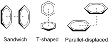 Les énergies de liaison relatives de ces trois configurations géométriques du dimère de benzène peuvent être expliquées par un équilibre des forces quadripolaire / quadripolaire et des forces de London. Bien que le benzène n'ait pas de moment dipolaire, il a un moment quadripolaire fort[5]. Le dipôle C – H local signifie qu'il y a une charge positive sur les atomes dans le cycle et une charge négative correspondante représentant un nuage d'électrons au-dessus et au-dessous du cycle. Le moment quadripolaire est inversé pour l'hexafluorobenzène en raison de l'électronégativité du fluor. Le dimère de benzène dans la configuration sandwich est stabilisé par les forces de dispersion de London mais déstabilisé par des interactions répulsives quadripolaires / quadripolaires. En décalant l'un des anneaux benzéniques, la configuration parallèle déplacée réduit ces interactions répulsives et est stabilisée. La grande polarisabilité des cycles aromatiques conduit à des interactions dispersives comme contribution majeure aux effets d'empilement. Ceux-ci jouent un rôle majeur pour les interactions des nucléobases, par exemple dans l'ADN[6]. La configuration en forme de T bénéficie d'interactions quadripolaires / quadripolaires favorables, car le quadripôle positif d'un anneau benzénique interagit avec le quadripôle négatif de l'autre. Les anneaux benzéniques sont les plus éloignés dans cette configuration, de sorte que les interactions quadripolaires / quadripolaires favorables compensent évidemment la diminution des forces de dispersion.