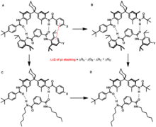 Dans une expérience non différente des autres mentionnées ci-dessus, Paliwal et ses coauteurs ont construit une balance de torsion moléculaire à partir d'un ester arylique avec deux états conformationnels[16]. L'état plié avait une interaction d'empilement pi bien définie avec une géométrie en forme de T, alors que l'état déplié n'avait pas d'interactions aryl-aryle. Les déplacements chimiques RMN des deux conformations étaient distincts et pouvaient être utilisés pour déterminer le rapport des deux états, qui était interprété comme une mesure des forces intramoléculaires. Les auteurs rapportent qu'une préférence pour l'état replié n'est pas unique aux esters d'aryle. Par exemple, l'ester cyclohexylique a favorisé l'état replié plus que l'ester phénylique, et l'ester tert-butylique a favorisé l'état replié d'une préférence supérieure à celle montrée par tout ester arylique. Cela suggère que l'aromaticité n'est pas une exigence stricte pour une interaction favorable avec un cycle aromatique.