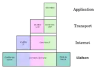 Par exemple, l'Internet est basé sur l'Internet Protocol version 4 et la plupart des applications utilisent aussi bien l'UDP (User Datagram Protocol) que le TCP (Transmission Control Protocol). Ainsi un fragment de donnée est encapsulé dans un datagramme UDP qui lui-même est encapsulé dans un paquet IP, ce dernier étant alors envoyé via un protocole de la couche de liaison (par exemple Ethernet). La couche de liaison est responsable de la transmission physique des données ; IP ajoute l'adressage des ordinateurs individuels ; UDP ajoute « l'adressage des applications » (c'est-à-dire le port spécifiant le service comme un service web ou un serveur TFTP).