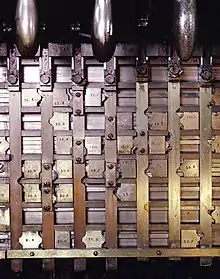 Cette table, pouvant être soit horizontale soit verticale et située derrière les leviers est constituée, en général, de barres qui relient les leviers les uns aux autres et de taquets qui assurent les incompatibilités demandées par le programme d’exploitation.