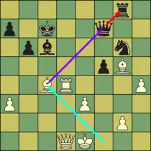Dans ce diagramme, les Blancs au trait, le roi est pris en enfilade par le fou noir. Il s'agit ici d'une enfilade absolue, car les règles du jeu imposent que l'échec soit paré. Après l'un des quelques coups légaux des Blancs, les Noirs capturent la dame blanche.