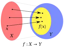 est une fonction de dans . L'ovale jaune dans est l'image de .