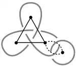 Définissez ensuite un graphe planaire dont les sommets sont au "centre" de chaque zone blanche, et dont les arêtes passent par chaque croisement, entre les deux brins de l'entrelacs. L'information du dessus-dessous est codée par un signe + ou - étiquetant chaque arête. L'arête est étiquetée + si le brin venant de la gauche passe au-dessus, et étiquetée - sinon.