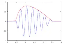 Enveloppe (en rouge) et signal modulé en amplitude (en bleu).