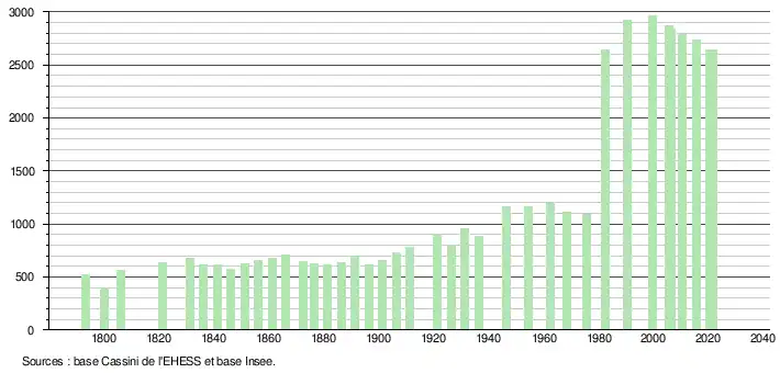 L'évolution du nombre d'habitants est connue à travers les recensements de la population effectués dans la commune depuis 1793. Pour les communes de moins de 10 000 habitants, une enquête de recensement portant sur toute la population est réalisée tous les cinq ans, les populations légales des années intermédiaires étant quant à elles estimées par interpolation ou extrapolation[23]. Pour la commune, le premier recensement exhaustif entrant dans le cadre du nouveau dispositif a été réalisé en 2005[24].
