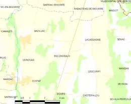 Les communes les plus proches[Note 1] sont[3] : Lescurry (2,0 km), Castéra-Lou (2,3 km), Tostat (2,4 km), Lacassagne (2,4 km), Ugnouas (2,5 km), Bazillac (2,9 km), Villenave-près-Marsac (3,4 km), Marsac (3,7 km).