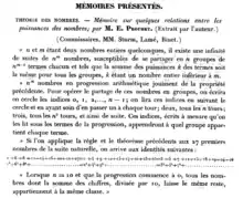 - Wright écrit à ce propos dans son article Prouhet's 1851 solution of the Tarry-Escott problem of 1910 Amer. Math. Monthly, 66 (mars 1959), 199-201:« Prouhet's note is no more than an "Extrait par l'auteur" of a "Mémoire présenté" to the Academy. The secretaire-archiviste of the Academy was kind enough to inform me that the memoir was returned to the author in 1852. But there appears to be no trace in the literature of its publication. »