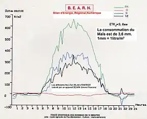 Soit une évapotranspiration de référence (ETo), par exemple pour une parcelle d'herbe haute de 12 cm suffisamment hydratée[44] calculée avec la formule de Pennman-Monteith. À partir de cette ETo est ensuite calculée l'évapotranspiration pour une culture spécifique (ETc), par exemple un champ de blé.