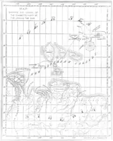 La Jeannette quitte la Californie le avec 32 hommes[46]. Après trois semaines de voyage, le 1er août, elle pénètre en mer de Béring et mouille dans la baie Kolioutchine. Là, l'équipage peut apprendre la réussite de l'expédition Nordenskjöld dans la conquête du passage du Nord-Est. Après avoir embarqué des chiens esquimaux à St. Michael en Alaska, le navire franchit le détroit de Béring le 29 août. L'île Herald est atteinte le 4 septembre. De Long prend la décision de rejoindre la Terre de Wrangel, à l'est, en suivant la route prévue par Gustave Lambert en 1870 mais la glace enserre le navire, ce qui impose l'hivernage pour le bateau et son équipage[47]. La Jeannette dérive vers l'ouest et la Terre de Wrangel est aperçue à la fin du mois ; De Long pense avec raison qu'il s'agit d'une île[47].