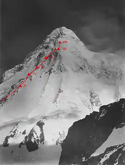 En 1953, quatre expéditions avaient déjà tenté l'ascension du K2. Oscar Eckenstein et le duc des Abruzzes, Louis-Amédée de Savoie, conduisent des expéditions en 1902 et 1909 respectivement, aucune ne parvenant à réaliser des progrès substantiels, le duc des Abruzzes déclarera même après son échec que cette montagne ne serait jamais vaincue[5]. Cependant, deux expéditions américaines en 1938 et 1939 parviennent à se rapprocher du sommet. L'expédition conduite par Charles Houston en 1938 confirme le fait que l'éperon des Abruzzes était une voie permettant d'atteindre le sommet, elle atteint l'« épaule du K2 » à 8 000 m, avant de redescendre en raison du manque de vivres et de matériel et à la dégradation des conditions météorologiques[6],[7]. L'expédition menée l'année suivante par Fritz Wiessner se rapproche encore davantage du sommet, mais elle se termine tragiquement avec la mort de quatre membres de l'expédition[8],[9]. Ces expéditions prouvent que l'ascension du K2 était réalisable et d'autres tentatives d'ascension auraient été réalisée si la Seconde Guerre mondiale et la première guerre indo-pakistanaise de 1947 n'avaient pas rendu les voyages au Cachemire quasiment impossibles pendant les années 1940[10].
