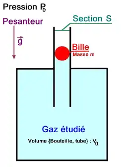 Pour faire cette expérience, on place le gaz à étudier dans un récipient étanche muni d'un tube. On y lâche ensuite une bille de diamètre exactement ajusté à celui du tube. Cette bille va alors osciller de haut en bas dans le tube.
