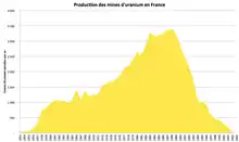 Un maximum de production est atteint dans les années 1980, puis cette industrie décline jusqu'à la fermeture de la mine de Jouac, en Haute-Vienne, en 2001, alors que l'extraction est délocalisée, notamment au Niger. Le principal gisement connu et encore non exploité sur le territoire national, correspond au site de Coutras, en Aquitaine, où la Cogema a mis en évidence un potentiel de 20 000 tonnes[5],[6] (soit 0,5 % du total mondial), mais avec peu de sites suffisamment rentables.