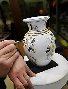 - Le décor peint à la main est réalisé sur un motif reporté à l'aide d'un poncif, certains décors peuvent être réalisés directement à main levée. Les pinceaux utilisés, adaptés à la surface pulvérulente et absorbante de l'émail stannifère doivent être à la fois raides et fournis pour contenir une réserve suffisante de couleur[4].