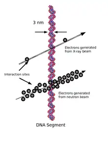 • Au niveau microscopique, pour un rayonnement traversant un tissu biologique, l'effet physique et chimique élémentaire dépend de la nature du rayonnement. Le gray, la grandeur de dose absorbée est l'une des grandeurs physiques en cause (énergie du rayonnement) ; l'effet dépend aussi du type de rayonnement et de contamination (externe, interne ou mixte) ainsi que du nombre et de la vulnérabilité des tissus et cellules traversés et dans une certaine mesure, du hasard. La traduction biologique de cet effet au niveau macroscopique (mesurée en Sievert) est un processus complexe encore en cours d'exploration.