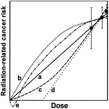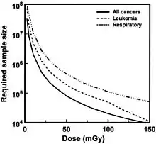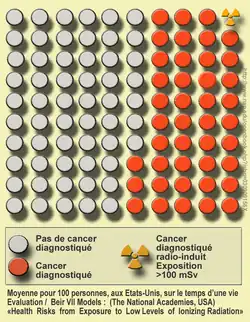 • L'effet macroscopique reste difficile à évaluer pour des expositions inférieures au centigray car il ne peut être statistiquement étudié que par des études épidémiologiques classiques, basées sur l’extrapolation des effets cancérogènes observés entre 0,2 et 3 sieverts[3]. En outre, cet effet dépend à la fois de la dose reçue et du débit de dose radioactive, d'une manière encore mal comprise.