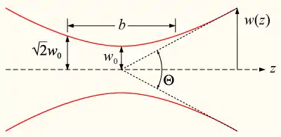 Pour un faisceau gaussien se propageant dans le vide, la largeur du faisceau sera à une valeur minimale de à son origine. Pour une longueur d'onde et à une distance le long de l'axe du faisceau, la variation de la largeur du faisceau sera :