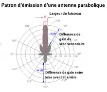 La taille de la surface formant un « réflecteur parabolique » est relativement petite en général devant la longueur d'onde du signal émis et il n'est alors pas possible de négliger les phénomènes de diffraction. Chaque point de la surface du « réflecteur » va rayonner comme une source ponctuelle, et le champ total émis en un point est la somme cohérente de tous les champs infinitésimaux. Tout se passe comme dans le cas de la diffraction d'une onde par une ouverture. Quel que soit donc le type d'antenne parabolique, le diagramme d'émission comporte un lobe principal dans la direction d'émission et des lobes secondaires tout autour de la sphère centrée sur l'antenne et qu'on tente de minimiser.
