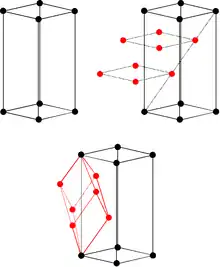La maille conventionnelle du réseau rhomboédrique (figure 2) est obtenue en ajoutant deux nœuds (nœuds rouges dans la figure) dans le volume de la maille conventionnelle du réseau hexagonal (à gauche). Les cristaux qui possèdent ces deux types de maille appartiennent à la famille cristalline hexagonale. La maille primitive (rhomboédrique) est dessinée en rouge dans la partie inférieure de la figure.