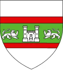Ecartelé 1 et 4 de gueules, 2 et 3 de sinople; brochant sur le tout une tour donjonnée à senestre d'argent surmonté d'une aigle au vol éployé du même.