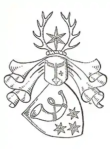 - Les armoiries de la famille montrent en bleu un cor de chasse doré (forme médiévale : huchet (de) avec ruban) sur trois (2 : 1) étoiles dorées. Sur le casque aux coques bleues et dorées, une étoile dorée entre deux bâtons de cerf naturels.