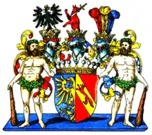 - Les armoiries de 1846 (lignées de Ruppersdorf et Zülzendorf) montrent dans un écu fendu à droite en bleu un demi-aigle royal sur la fente, à gauche en rouge dans une barre droite oblique dorée un renard naturel courant. Trois casques : à droite avec une couverture rouge et or un aigle noir couronné d'or et blindé, au milieu avec une couverture rouge et or à droite et bleu et or à droite le renard poussant avec un flan à pointe d'or épée dans ses crocs, à gauche avec couverture bleu-or trois plumes d'autruche (rouge-or-bleu). Porte-boucliers : deux hommes sauvages tournés vers l'avant avec des couronnes vertes sur la tête et les reins, chacun s'appuyant sur une massue avec leurs mains libres[2].