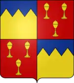 - D'or au chef d'azur emmanché de deux pièces et deux demies écartelé de gueules à 3 coupes ouvertes d'or posées 2 en chef et 1 en pointe[30],[33]