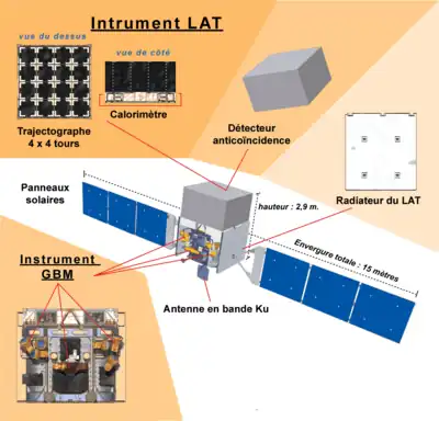 Le télescope spatial Fermi a la forme d'un parallélépipède de 2,5 mètres de côté et de 2,8 mètres de haut avec une masse de 4,3 tonnes. Il comporte deux panneaux solaires déployés en orbite qui fournissent 3,1 kW et donnent au satellite une envergure de 15 mètres. Le télescope spatial embarque deux instruments : le LAT pour les rayons gamma de haute énergie (masse de 3 tonnes) qui constitue l'instrument principal et le GBM pour les énergies plus faibles (masse de 115 kg)[3],[4].