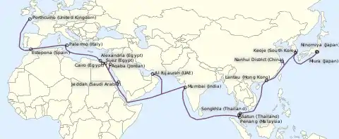 Le câble FLAG Alcatel-Lucent Optical Network (FALCON), reliant l'Inde et plusieurs pays du Golfe Persique, est devenu opérationnel en [10]. It has landing points in[11],[12]: