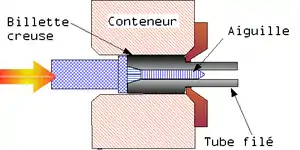 Le poinçon est équipé d'une aiguille qui est emmanchée sur la billette creuse. En poussant dans la filière, le métal est contenu entre la filière et l'aiguille. On obtient un tube monobloc sans soudure.