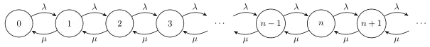La chaîne de Markov à temps continu sous-jacente est la même que pour un processus de naissance et de mort[1] :