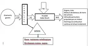 Un autre moyen de produire de l’hydrogène est la pyrolyse du méthane, produisant simultanément de l’hydrogène et du noir de carbone, utile à la fabrication de pneus, de revêtements routiers, d’engrais, etc. Ce procédé ne génère pas directement[Combien ?] d'émission de dioxyde de carbone[4],[5] et peut valoriser des rejets de méthane, puissant gaz à effet de serre, issu par exemple du gaz de mines, du biométhane[5] ou de gisements gaziers[réf. souhaitée].