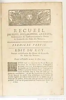 - Louis XIV (roi de France ; 1638-1715)., Recueil des édits, déclarations, ordonnances, tarifs, arrests, reglemens et instructions concernant la ferme des droits de controlle des actes des notaires, petits sceaux, insinuations laïques, &c., Paris, Vve Saugrain et P. Prault, (lire en ligne), pages 1 à 5