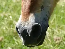 Quelques Fjords, plus rares, expriment le gène Crème, qui en agissant avec le gène Dun, est à l'origine des robes les plus claires chez la race[51]. Les Fjords possèdent aussi les traits du pangaré, comme le prouvent la décoloration du bout de nez, du ventre, de l'intérieur des jambes et du contour des yeux[47].