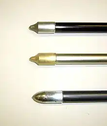 - La pointe en acier voire tungstène, qui s'enfiche dans l'extrémité avant de la hampe. Elle doit être lourde pour assurer la puissance de la flèche, mais elle doit rester assez légère pour limiter la flèche de la flèche. Pour le tir à l'arc sur cible, la forme de la pointe est généralement parabolique.