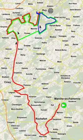 Après avoir commencé la course à Marche-en-Famenne, les coureurs se déplacent vers le sud, avant de tourner vers le nord après 13 km en passant par Rochefort. Il y a alors un parcours plat de 50 km qui a amène le peloton à Ohey, où les coureurs entrent dans une série de circuits autour de Huy. La première ascension est la côte de Bellaire après 67 km, suivies par la côte de Bohissau, la côte de Solières et la première ascension du Mur de Huy, qui arrive avec 101 km, alors qu'il reste 95 km. Le prochain circuit emmène les coureurs au sud-est de Huy, à travers la côte d'Ereffe, et de retour à Ohey. Ils suivent ensuite la même séquence vallonnée avec la côte de Bellaire, la côte de Bohissau, la côte de Solières et le Mur de Huy. La deuxième ascension du Mur intervient alors qu'il reste 29 km à parcourir[4][réf. incomplète],[5][réf. incomplète].