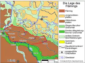 Elle est située pour l'essentiel dans le land de Brandebourg, mais sa partie ouest est en Saxe-Anhalt. Le nom de Flamain est dérivé des colons médiévaux flamands. Composante de la plaine d'Allemagne du Nord, c'est une région de moraines de la période glaciaire avec sol sableux et collines peu hautes.