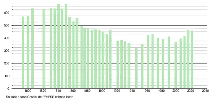 L'évolution du nombre d'habitants est connue à travers les recensements de la population effectués dans la commune depuis 1793. Pour les communes de moins de 10 000 habitants, une enquête de recensement portant sur toute la population est réalisée tous les cinq ans, les populations légales des années intermédiaires étant quant à elles estimées par interpolation ou extrapolation[19]. Pour la commune, le premier recensement exhaustif entrant dans le cadre du nouveau dispositif a été réalisé en 2006[20].