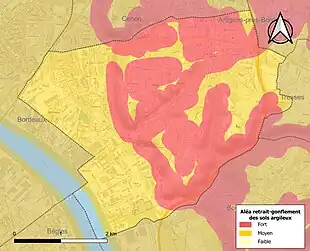 Le retrait-gonflement des sols argileux est susceptible d'engendrer des dommages importants aux bâtiments en cas d’alternance de périodes de sécheresse et de pluie. 98,5 % de la superficie communale est en aléa moyen ou fort (67,4 % au niveau départemental et 48,5 % au niveau national). Sur les 3 754 bâtiments dénombrés sur la commune en 2019, 3 754 sont en aléa moyen ou fort, soit 100 %, à comparer aux 84 % au niveau départemental et 54 % au niveau national. Une cartographie de l'exposition du territoire national au retrait gonflement des sols argileux est disponible sur le site du BRGM[28],[Carte 2].