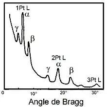 - Quelques années plus tard, Barkla nomme fluorescence X le rayonnement X secondaire, c'est-à-dire émis par un matériau lui-même soumis à un rayonnement X[2],[3],[4],[5]. Max von Laue a l'idée d'utiliser un cristal pour disperser les longueurs d'onde des rayons X, mais c'est à William Henry Bragg et à son fils William Lawrence que l'on doit l'essentiel de la théorie sur la diffraction des rayons X par un cristal et l'obtention en 1913 du premier spectre de rayons X. Ils publient en 1915 X-Rays and Crystal Structure[1].
