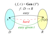On peut également demander que les fonctions de soient des permutations (auquel cas ), et on parle alors de « permutations à trappe ». À l'heure actuelle (2018) la seule construction connue susceptible de donner une permutation à trappe repose sur le problème RSA ou une variante mineure de celui-ci[14].