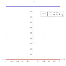 Représentation graphique de la fonction de Dirichlet, deux lignes parallèles qui semblent solides. La ligne bleue (resp. rouge) représente les nombres rationnels (resp. irrationnels), qui sont proches les uns des autres dans les réels. Le graphe contient un nombre indénombrable (resp. dénombrable) de trous dans la ligne bleue (resp. rouge), mais comme ils sont de longueur nulle on ne les voit pas.